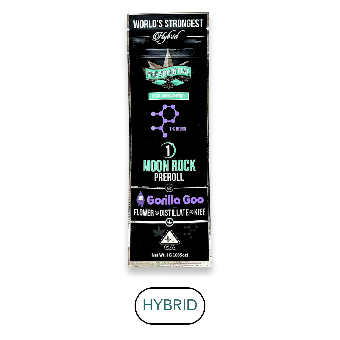 Your Presidential Moon Rock Prerolls consist of estate grown, single sourced flower cultivated by the award-winning THC Design. The flower is then INFUSED with premium distillate, using Presidential’s proprietary infusion process that enables us to permeate the flower to the stem. Finally, it is coated in the highest quality kief, creating the slowest burning, most potent Moon Rocks on the market! Our Prerolls are ground and rolled for your enjoyment!