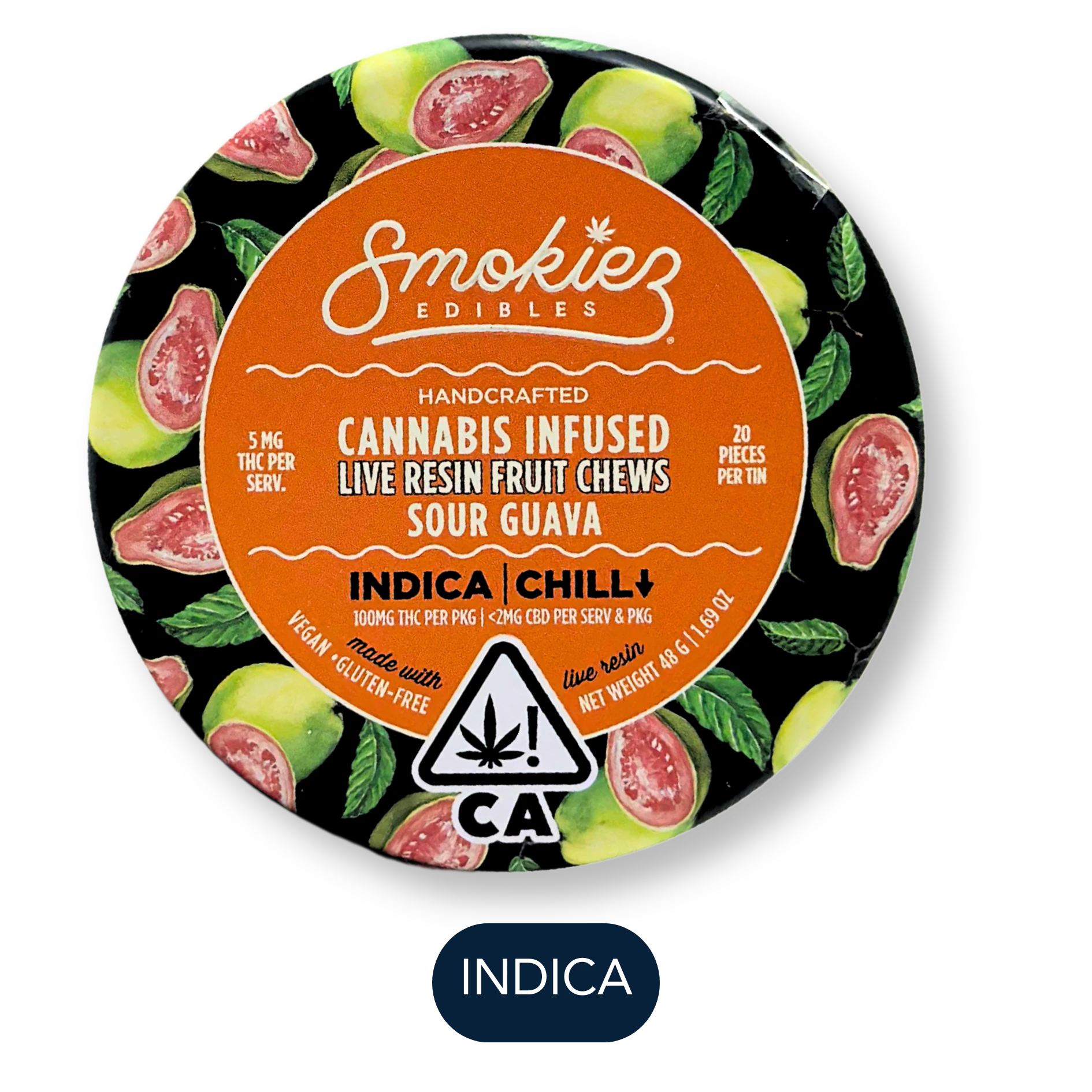 • 100% Natural Plant Based Colors - May change slightly from batch to batch!NEW!!! Introducing Smokiez™ Sour Guava Indica Live Resin THC Fruit Chews, packaged in a new conveniently sized stainless steel tin.